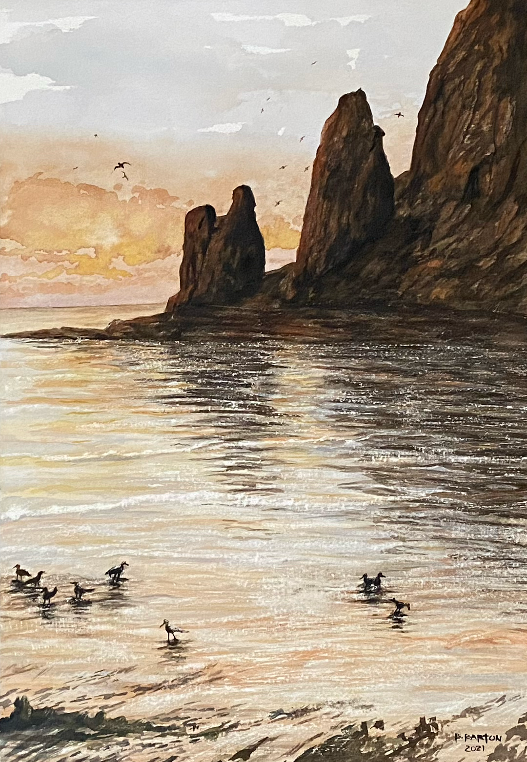 This unframed, 18"x21" original watercolor, of seabirds feeding along the Oregon coast, contrasts the peaceful vision of daily life and smoke blowing up from California wildfires coloring the sky.