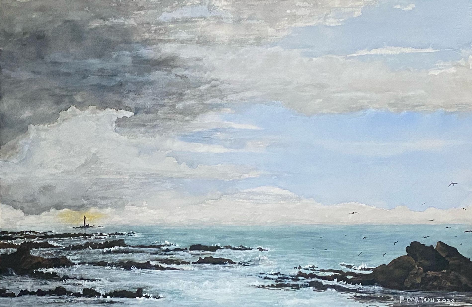 This 21” X 14” original painting of a glowing light house off the west coast of Scottland