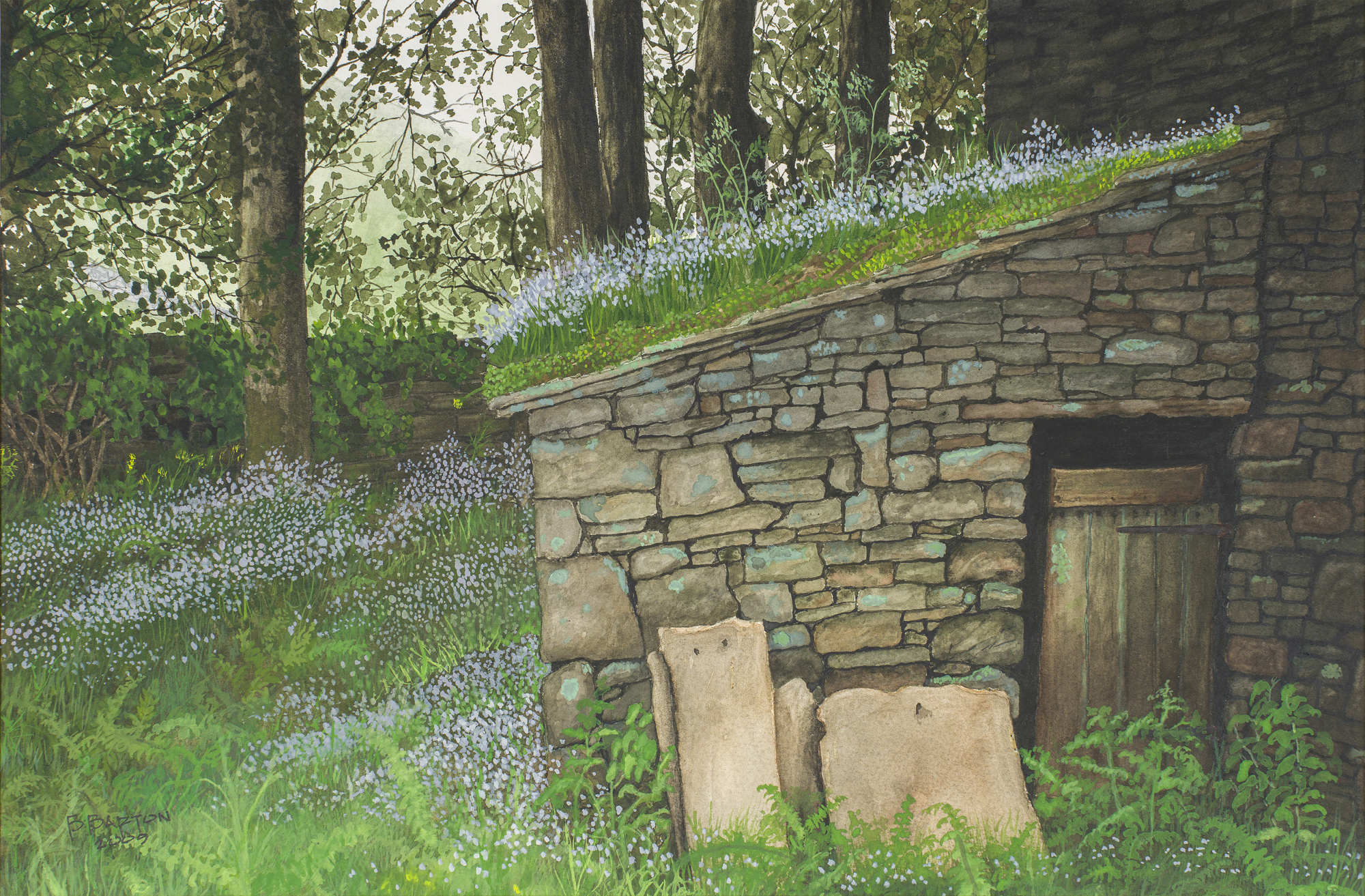 An English countryside is this hauntingly beautiful watercolor's location. The flowers on this slate roof calls us to join in tasks performed by the spirits dwelling near its wooden door.
